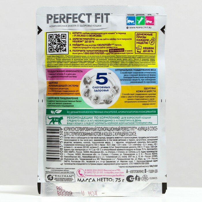 PERFECT FIT для взрослых кастрированных котов и стерилизованных кошек с курицей в соусе (75 гр х 28 шт)