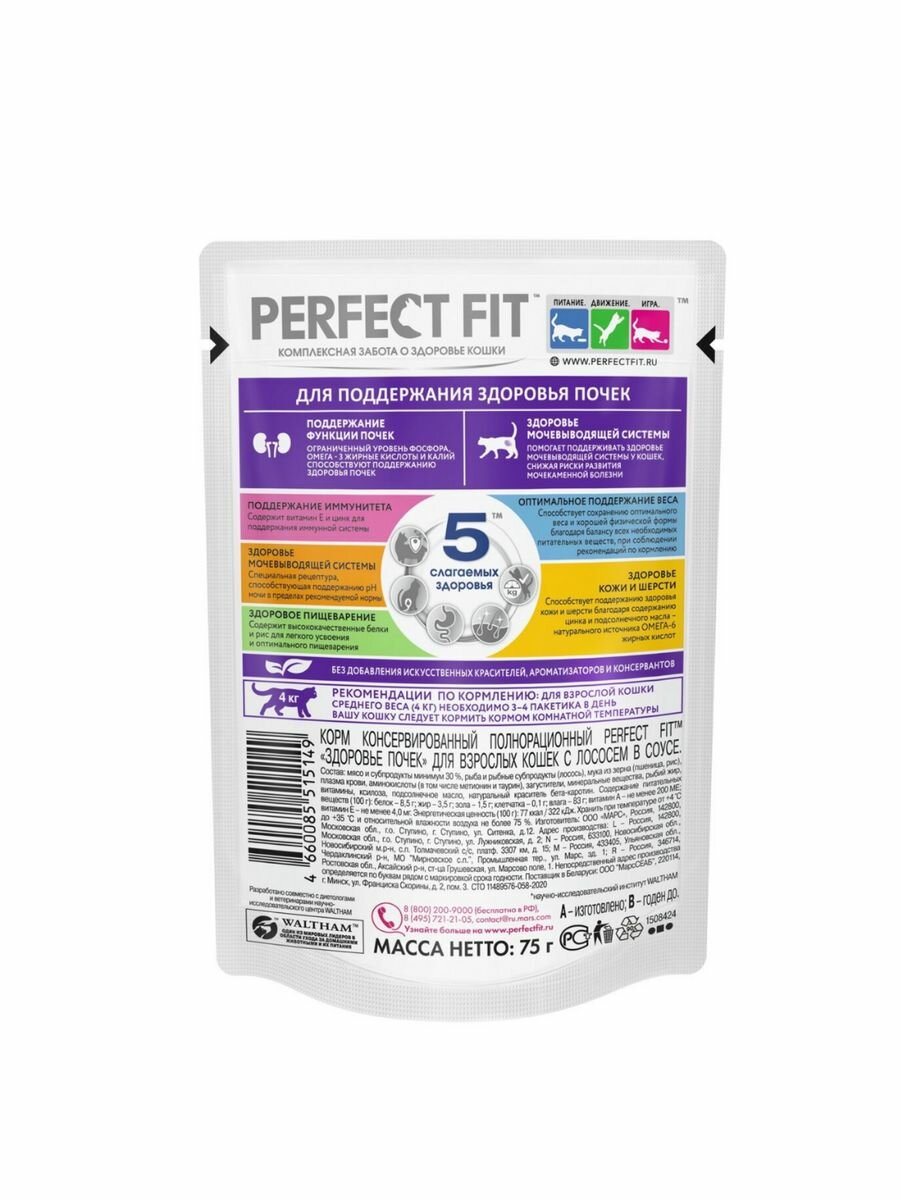 PERFECT FIT для взрослых кошек для поддержания здоровья почек с лососем в соусе пауч 75 гр NEW 75 гр х 12 шт