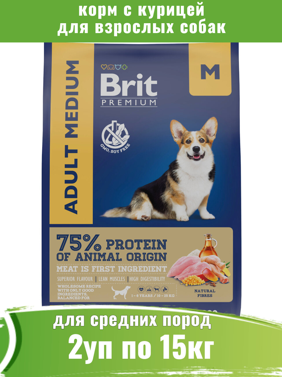 Брит Премиум Dog Adult Medium 15кг х 2шт курица для взрослых собак средних пород (10–25 кг )