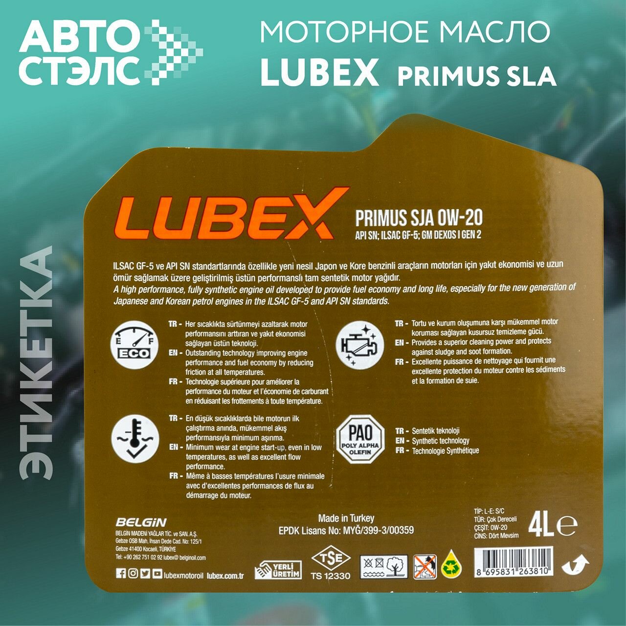 LUBEX L03413310404 LUBEX PRIMUS SJA 0W20 (4L)_масло моторное! синт.\API SN+RC, ILSAC GF-5, GM dexos1 Gen 2