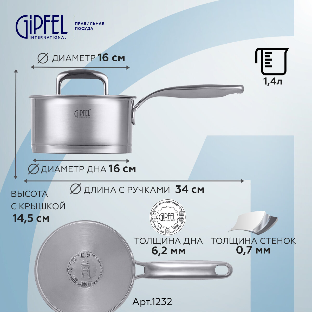 Ковш из нержавеющей стали Gipfel Prestige 1232 16 см/1,4 л интересное: