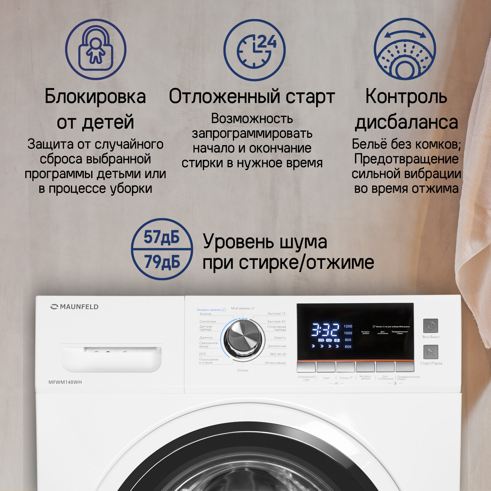 Стиральная машина MAUNFELD MFWM148WH полноразмерная, 8 кг, 16 программ, 1400 об/мин, инвертор, дисплей, 5 быстрых программ, установка в колонну интересное: