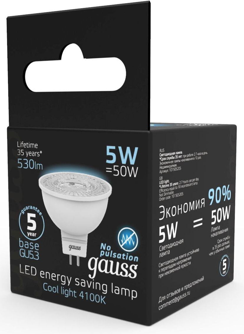 Лампа светодиодная gauss 101505205, GU5.3, MR16, 5 Вт, 4100 К