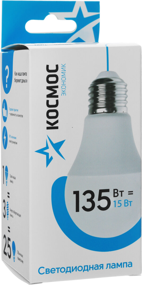 СохранитьСветодиодная лампа Космос, 15 Вт, Е27, 4500 K, груша, LED15wA60E2745, нейтральный белый интересное: