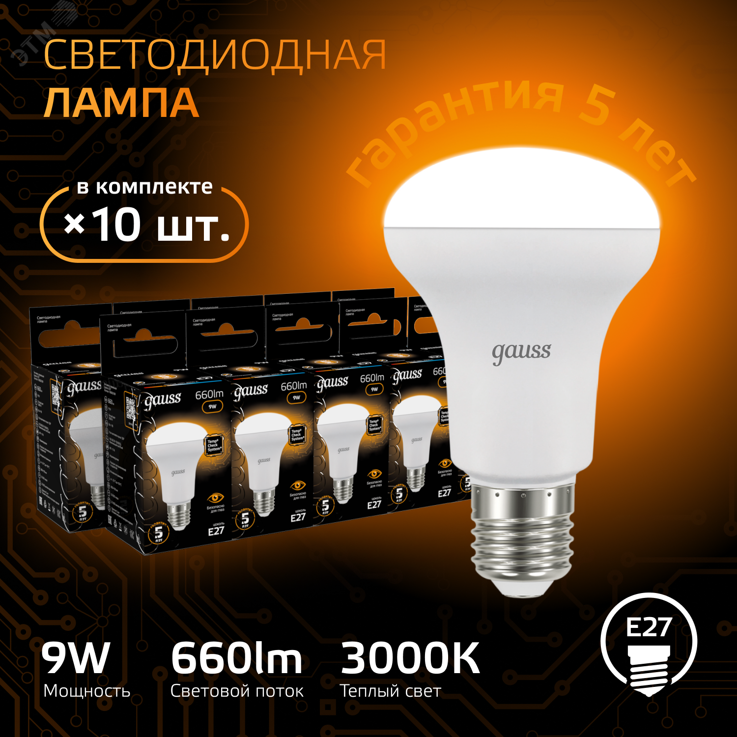 (10 шт)Лампа Gauss R63 9W 660lm 3000K E27 LED