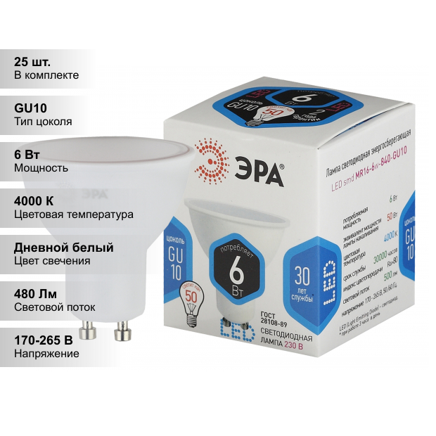 Купить (25 шт.) Светодиодная лампочка ЭРА LED smd MR16-6w-840-GU10