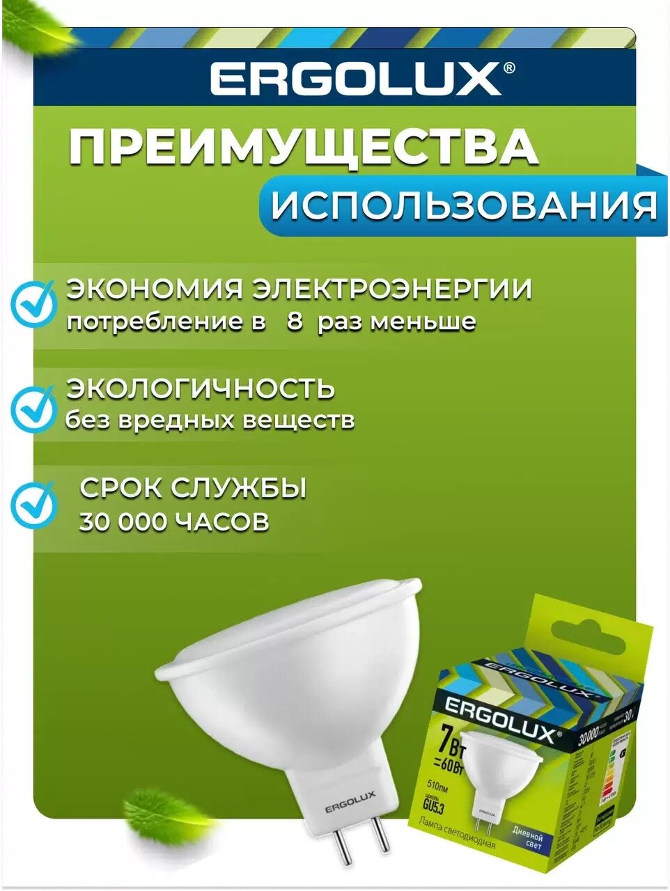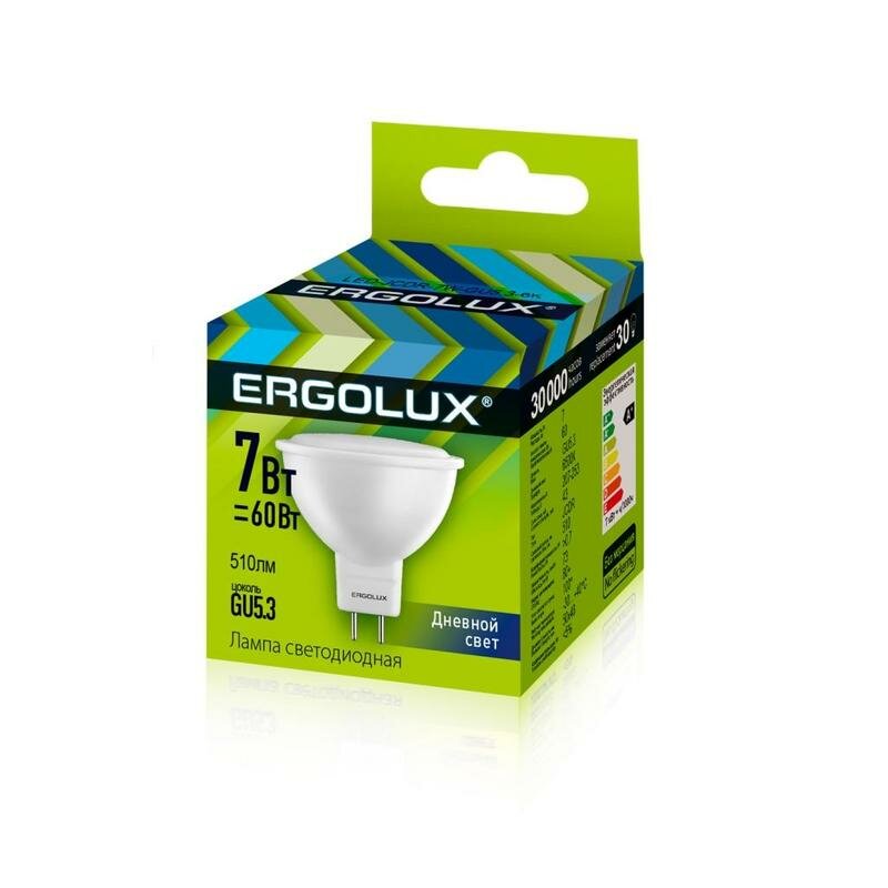 Лампочка светодиодная Ergolux GU5,3 7Вт, 6К, дневной белый свет, комплект 10шт