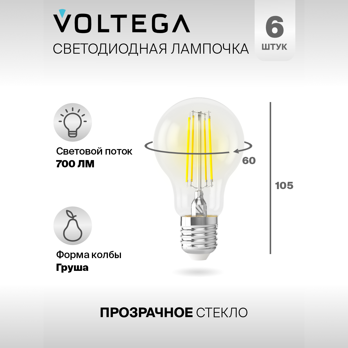 Лампочка светодиодная E27 форма груша 7W нейтральный свет Voltega Crystal A60 4000K упаковка 6 штук