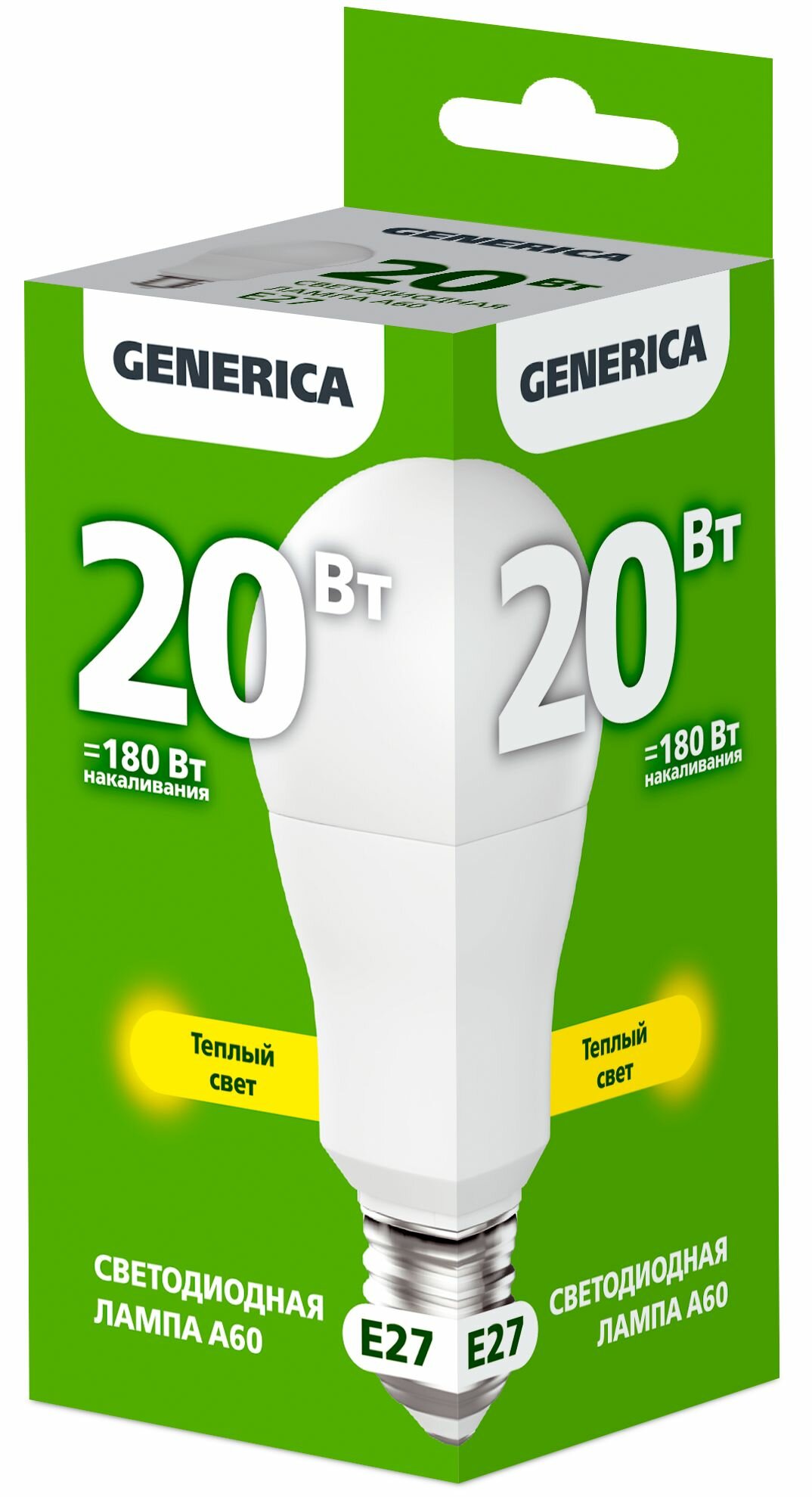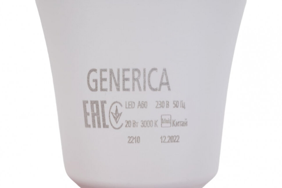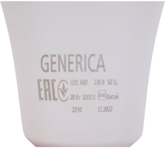 GENERICA Лампа светодиодная GENERICA A60, 20 Вт, груша, 3000 К, E27, 230 В, LL-A60-20-230-30-E27-G