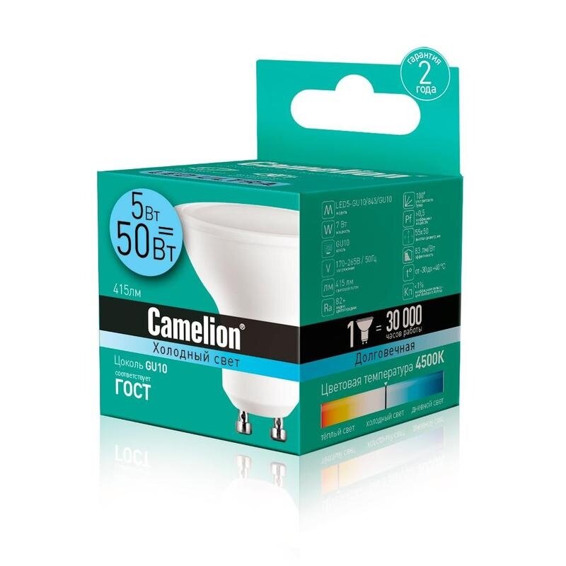 Лампа светодиодная GU10, 5 Вт, 50 Вт, 220 В, рефлектор, 4500 К, свет холодный белый, Camelion