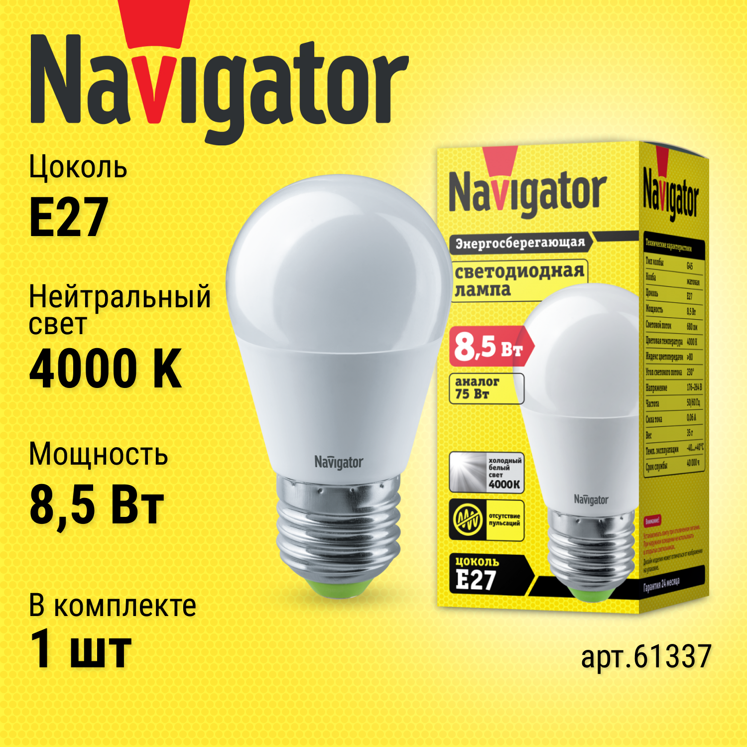 Лампа светодиодная 61 337 NLL-G45-8.5-230-4K-E27 | код. 61337 | Navigator (5шт.в упак.)