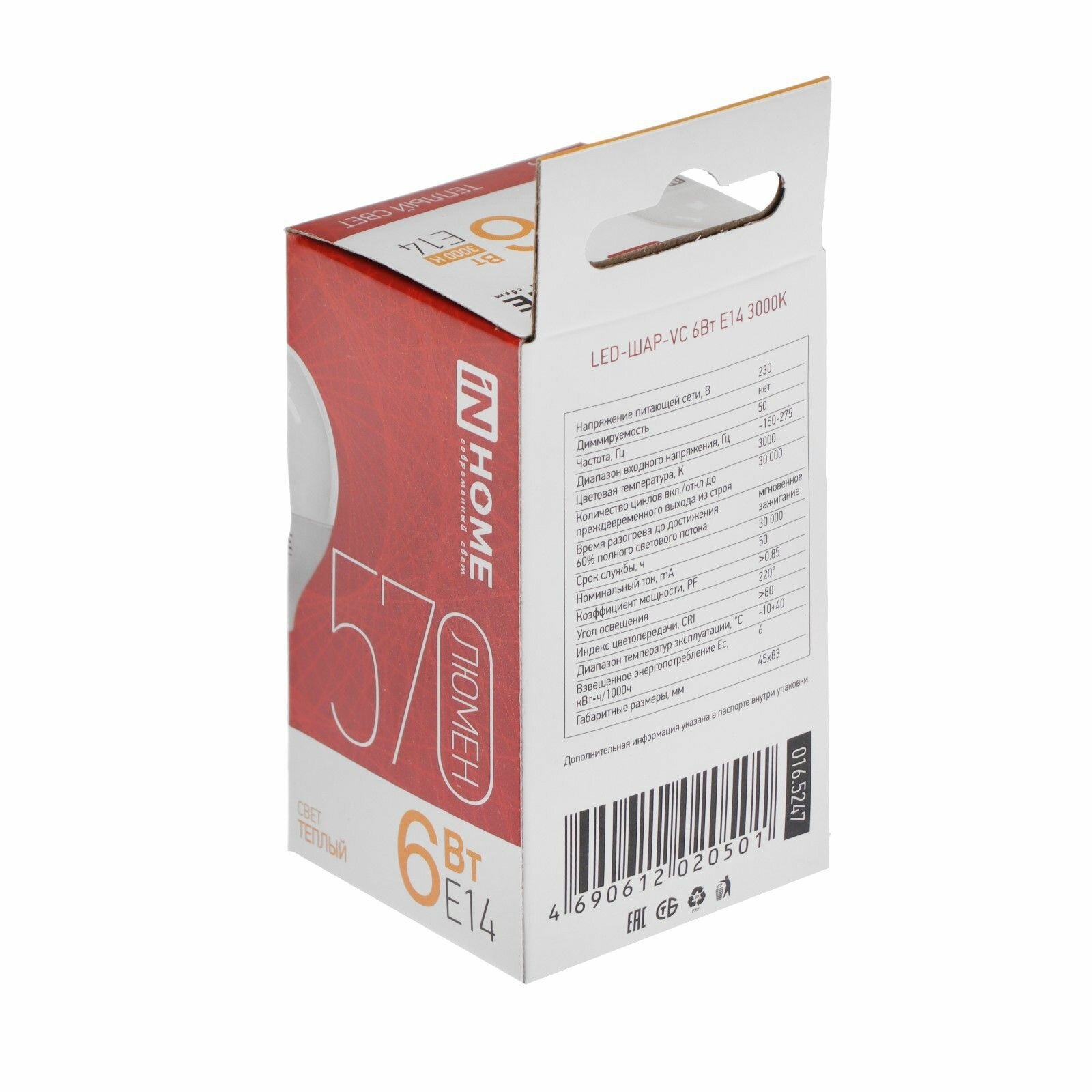 Светодиодная лампа IN HOME LED-ШАР-VC 6Вт 230В Е14 3000К 480Лм 4690612020501