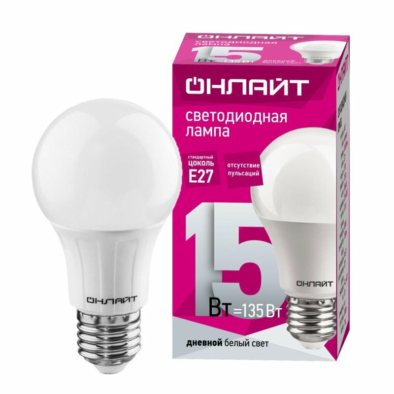 Лампа светодиодная ОНЛАЙТ 61151, E27, A60, 15 Вт, 6500 К