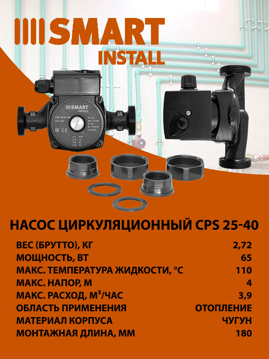 Циркуляционный насос Smart Install CPS 25-40 (H-4 м.,180 мм., 65 Вт.) с гайками