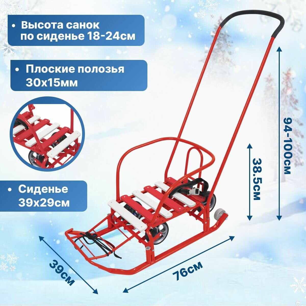 | Плюсы: | Очень удобные большие санки, Есть ремень безопасности, подставки под ноги. |