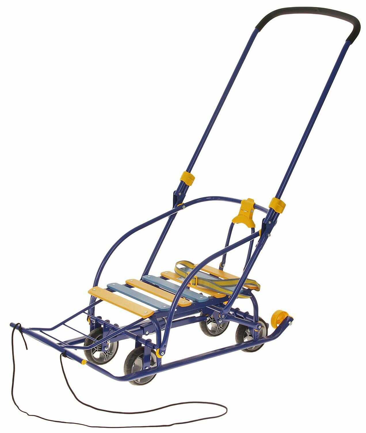 Купить Детские зимние складные санки Ника "Nikki 3" с выдвижными колёсами, складной спинкой, родительская ручкой, задними съемными колёсиками и страховочным ремнём, цвет синий