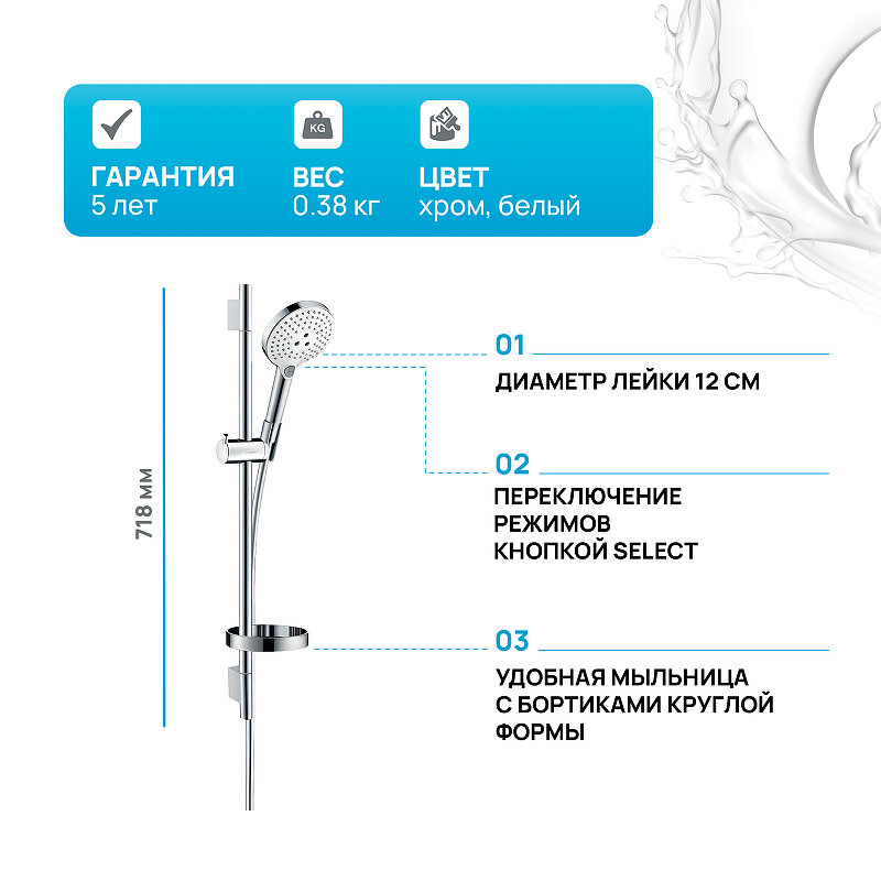 Душевой гарнитур Hansgrohe Raindance Select S, арт. 26630400, 3 режима, хром / белый, 72 см