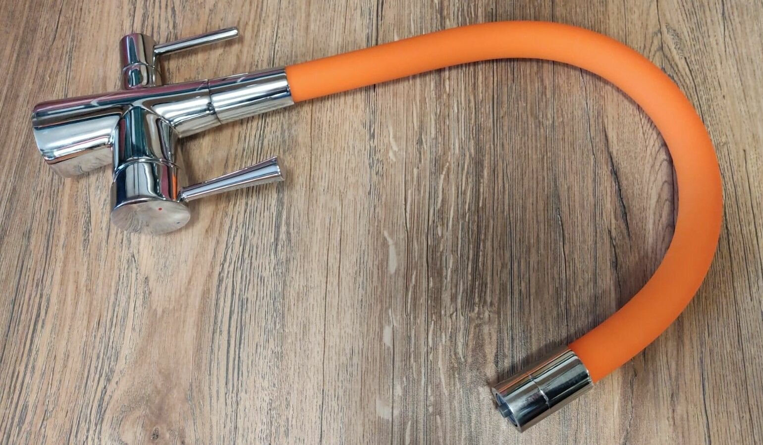 Нет держателя дополнительного для излива. Сам шланг очень плотный, как ты его загнул, так и стоит, держит форму. Приятный матовый силикон. |