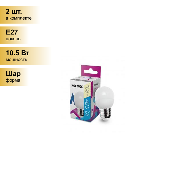 Купить (2 шт.) Светодиодная лампочка Космос шар E27 10,5W (10W) (840lm) 3000K 2K матов. 82x45 LkeLED10.5wGL45E2730 . Цоколь E27