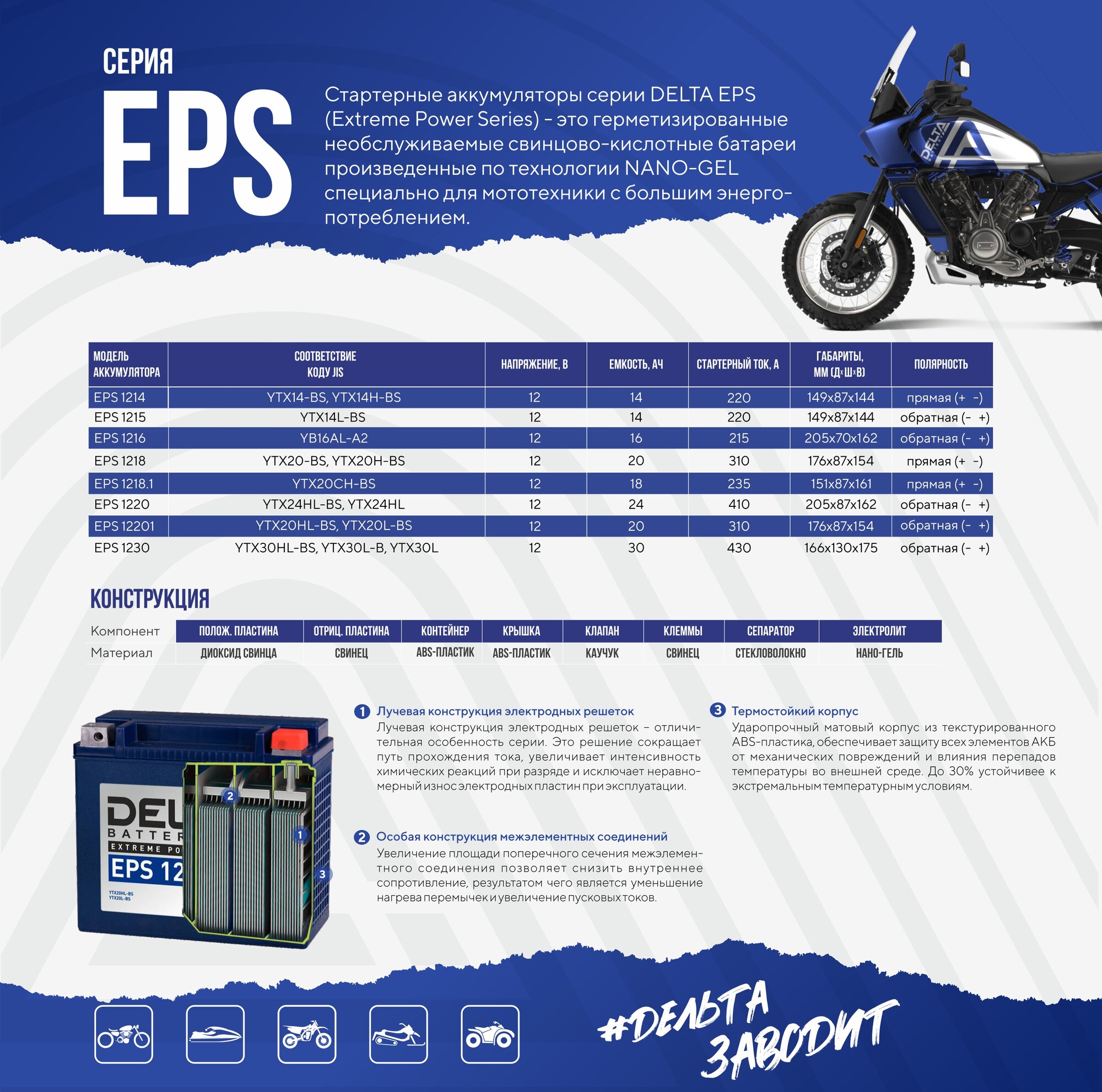 Мото, Скутер 12В 18 А.ч. Delta Eps, 245А, Пр.пол. Eps1218 (Ytx20h-Bs)(175X87x155)(Залитый)Agm DELTA battery арт. EPS1218