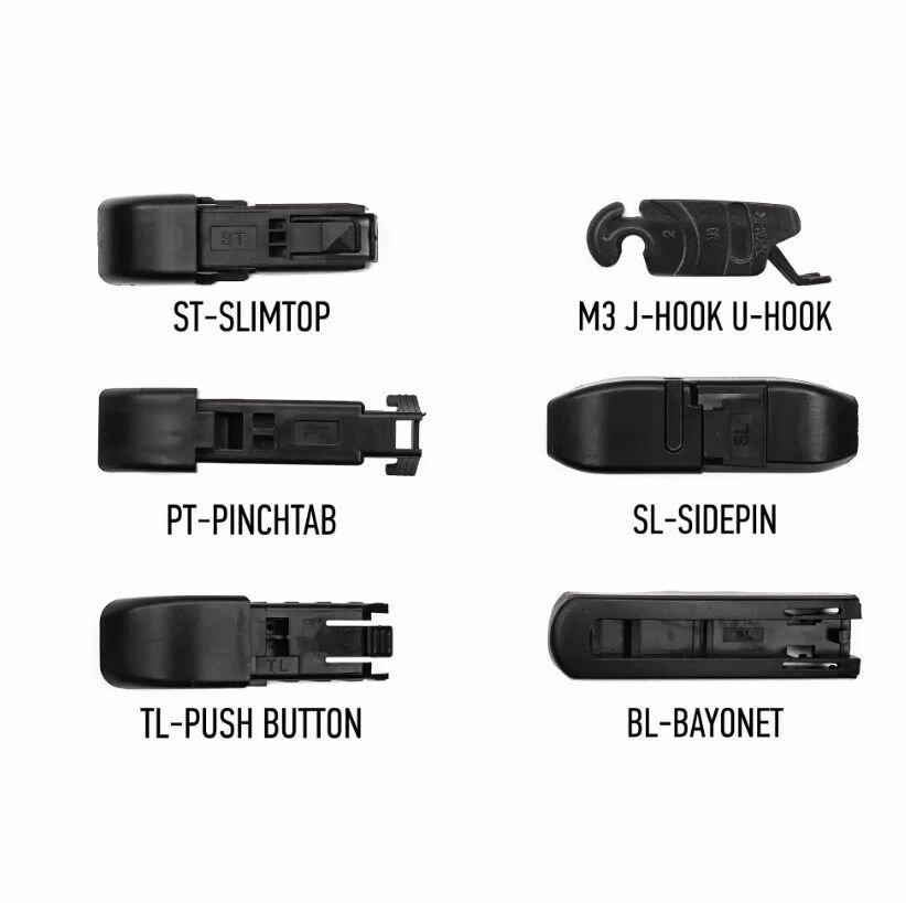 | Тип крепления | боковой зажим (pinch tab) / боковой штырь (side pin) / кнопка (push button) / крючок (hook) / узкая кнопка (narrow push button) / штыковой замок (bayonet) / штырь (pin lock) |