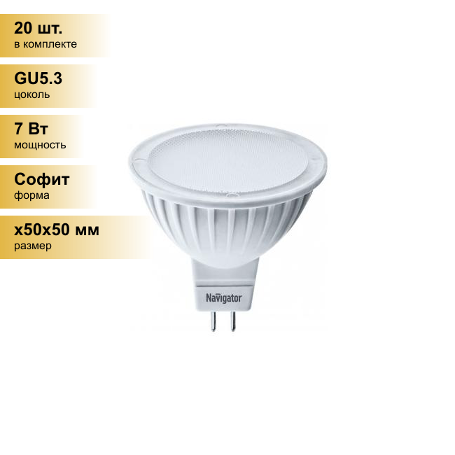 (20 шт.) Светодиодная лампочка Navigator MR16, мощность 7 Вт, напряжение питания 220 В, цветовая температура 6500 K, холодный белый свет, световой поток 595 Лм, цоколь GU5.3, размер Ø50х52 мм