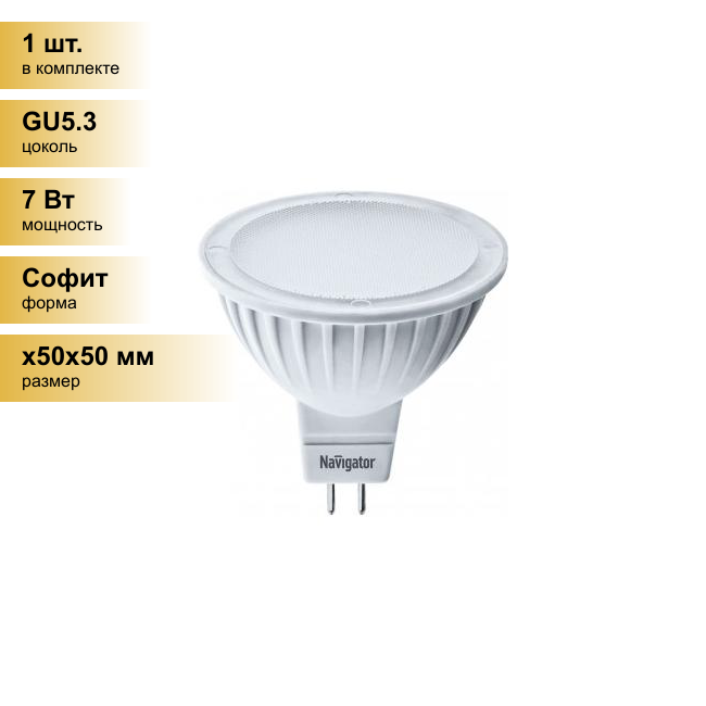 (7 шт.) Светодиодная лампочка Navigator MR16, мощность 7 Вт, напряжение питания 220 В, цветовая температура 4000 K, нейтральный белый свет, цоколь GU5.3, размер Ø50х52 мм