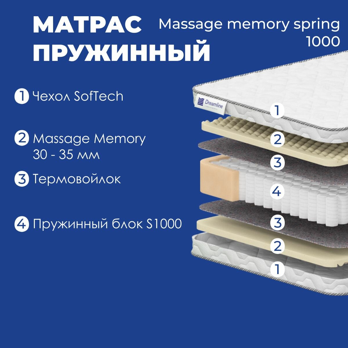 Матрас Дримлайн Пружинный Средняя жесткость Massage memory spring 1000 150х195х21