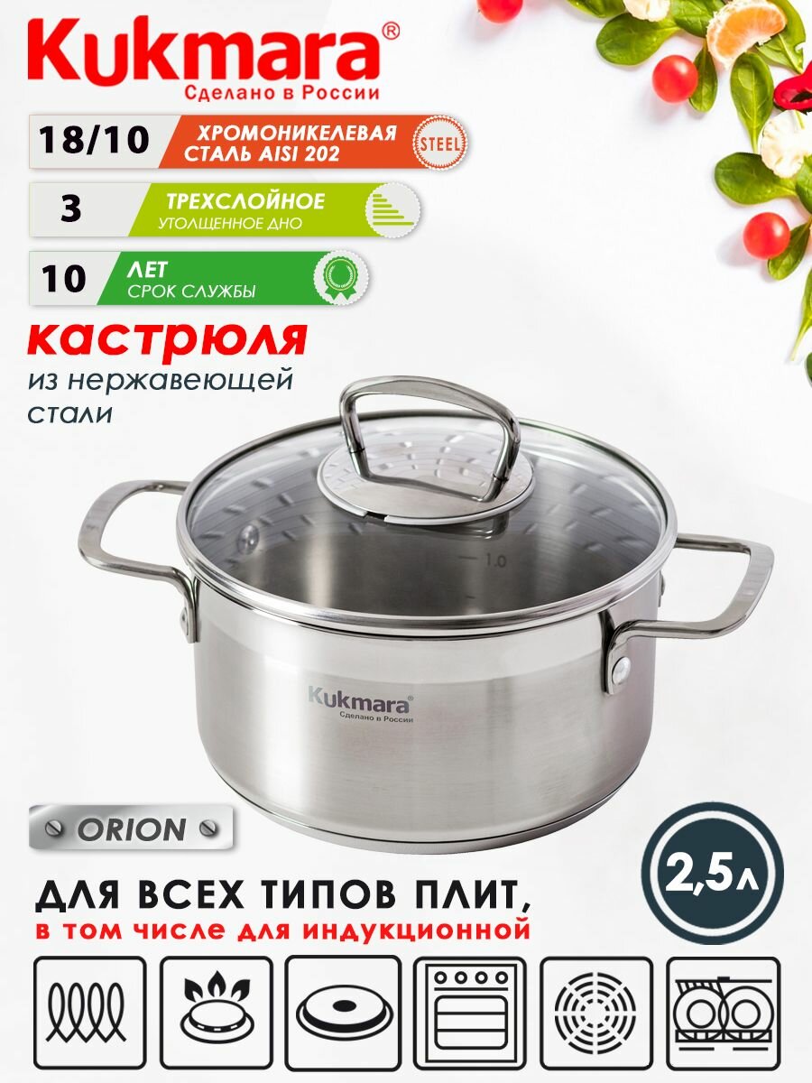 Купить Кастрюля нержавеющая 2,5л со стеклянной крышкой ORION ТМ KUKMARA