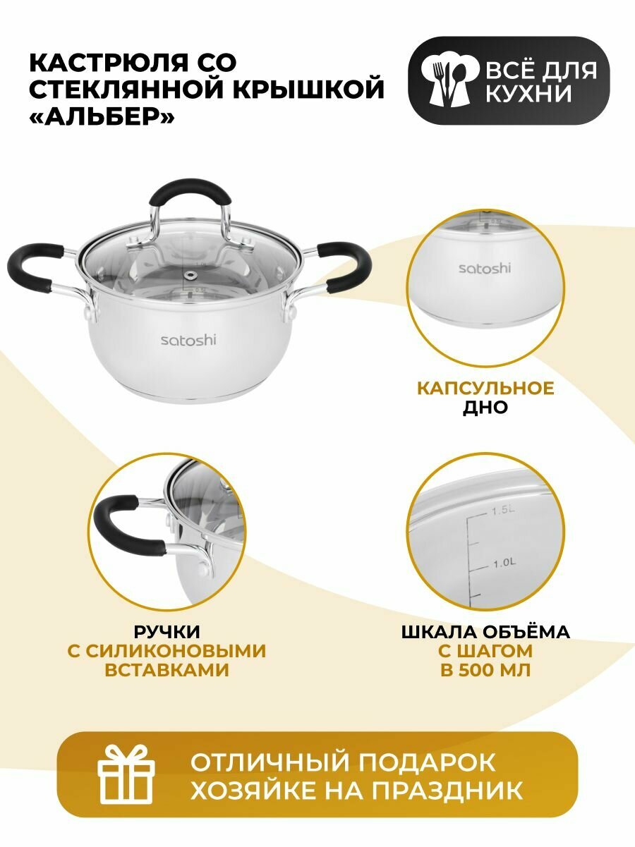 Кастрюля 2,5 л Satoshi Альбер со стеклянной крышкой, индукция, нержавеющая сталь