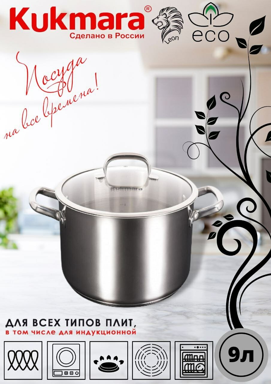 Кастрюля из нержавеющей стали со стеклянной крышкой Kukmara (Leon) LN-CA9026G, 9 л