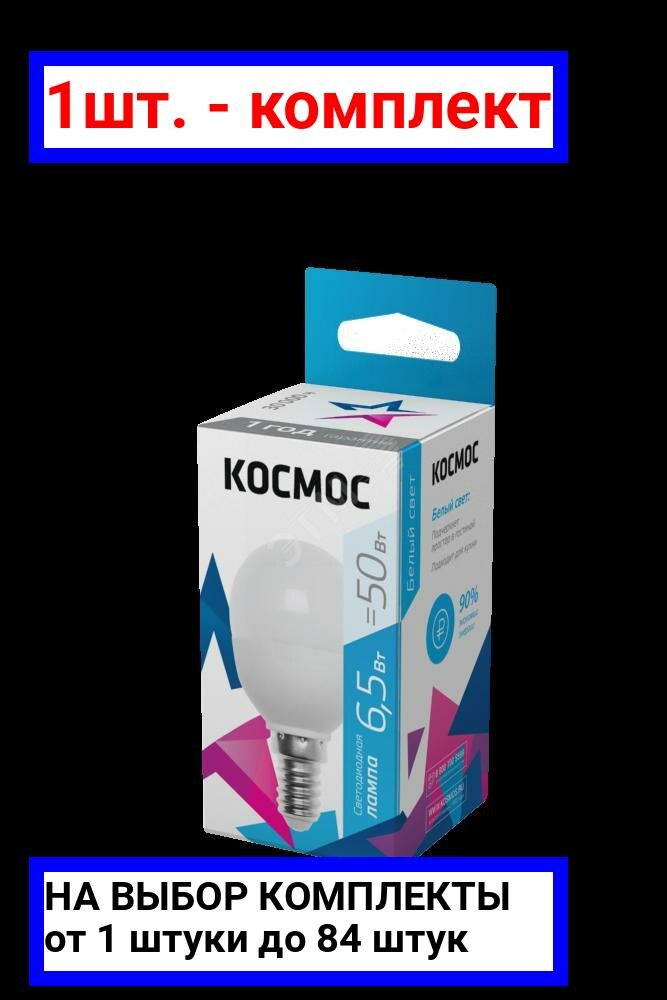 Купить Светодиодная лампа Космос, 6.5 Вт, E14, 4500 K, шар, LED6.5wGL45E1445, нейтральный белый