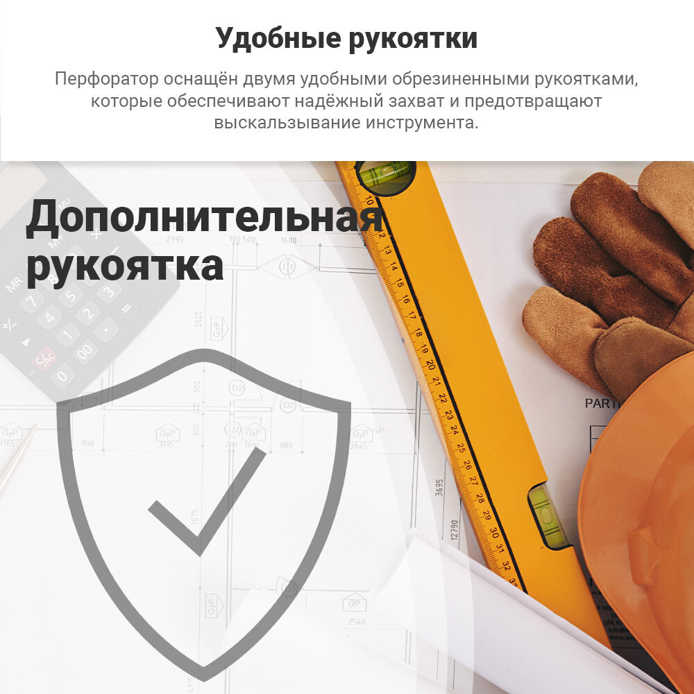 | Комплектация | перфоратор, дополнительная рукоятка, ограничитель глубины бурения, кейс, скоба крепления на ремень, ремень на запястье, переходник SDS plus под биту ¼", переходник SDS plus под сверлильный патрон ½" |