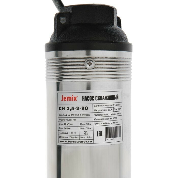 Насос скважинный, Jemix, 2 м, 900 Вт, максимальный напор 70 м, 2 м³/ч, термозащита, СН 3,5-2-80