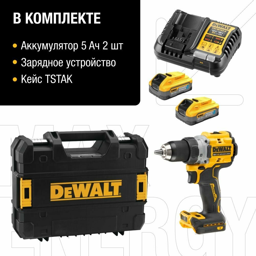 Купить Аккумуляторная бесщеточная дрель-шуруповерт DEWALT, 18В, 90 Нм, 2000 об/мин, с 2 АКБ 5 Ач и ЗУ, в кейсе TSTAK, DCD800H2T