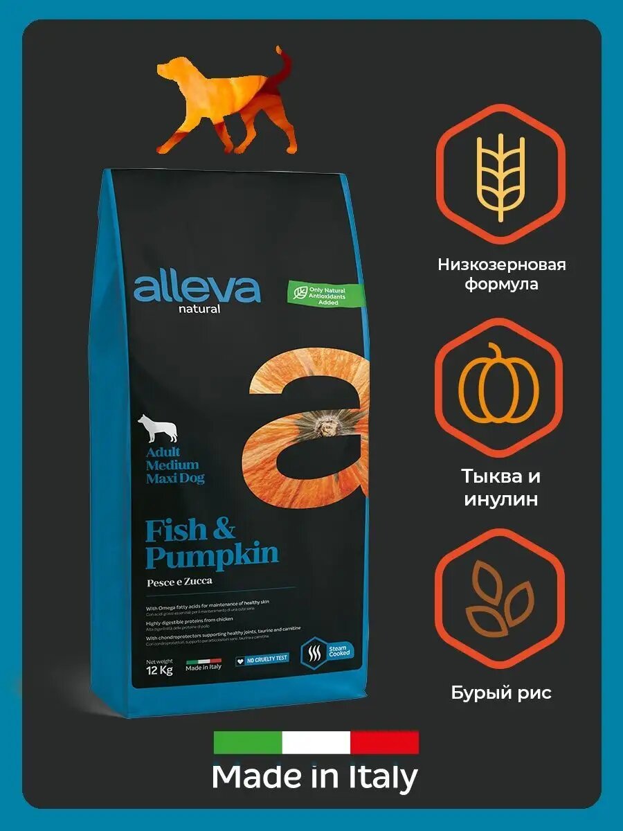 ALLEVA Полнорационный корм для взрослых собак всех пород. Курица с рыбой. 12 кг.