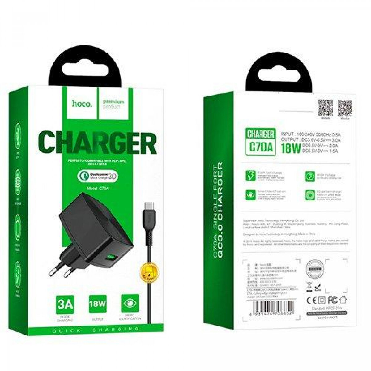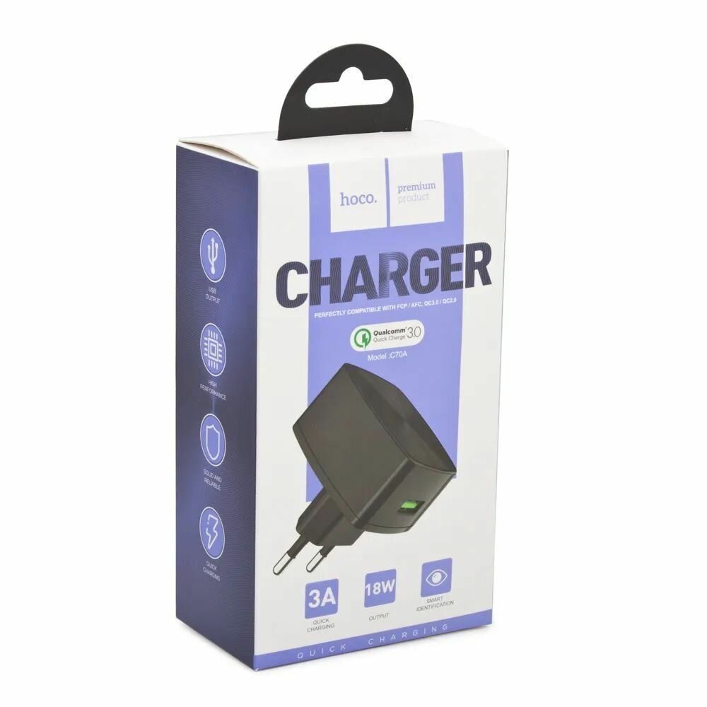 Сетевой адаптер - Hoco C70A USB, 3A/18W, с быстрой зарядкой, черный, 1 шт.