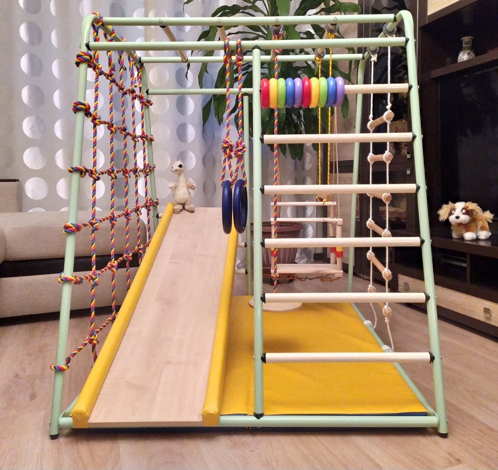 | В комплекте | веревочная лестница, гимнастические кольца, горка, качели, мат, сетка для лазания, тарзанка, трапеция |