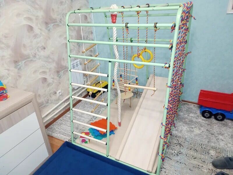 | В комплекте | веревочная лестница, гимнастические кольца, горка, канат, качели, мат, сетка для лазания, тарзанка, трапеция |