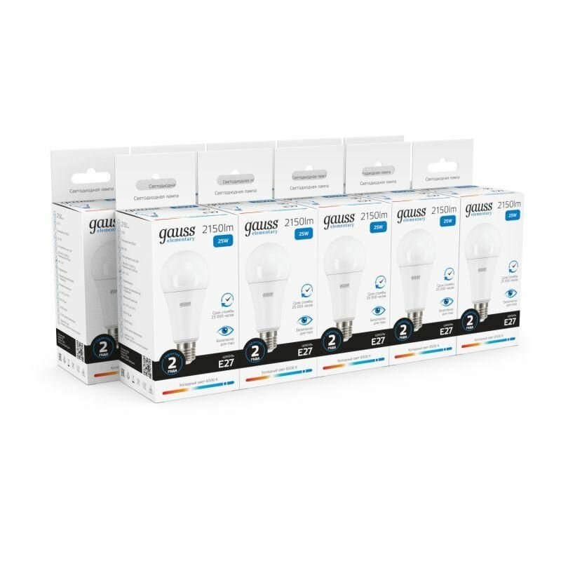 (20 шт.) Светодиодная лампочка Gauss Elementary ЛОН A67 E27 25W(2150lm) 6500K 6K 143x67 матовая, пластик/алюм. 73235 Холодный белый. Цоколь E27