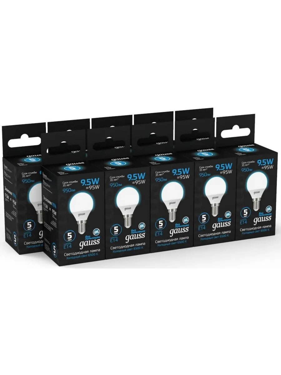Лампочка светодиодная Е14 Шар 9.5W холодный белый свет 6500К упаковка 10 шт. Gauss Black