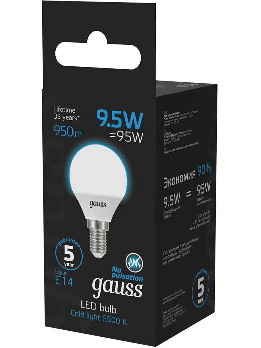 Gauss Лампа Шар 9.5W 950lm 6500K E14 LED 1/10/50 105101310
