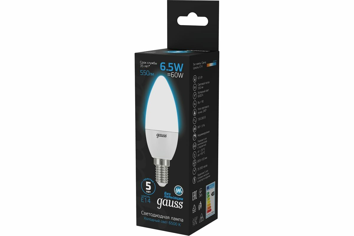 Лампочка светодиодная Е14 Свеча 6.5W холодный белый свет 6500К упаковка 10 шт. Gauss Black