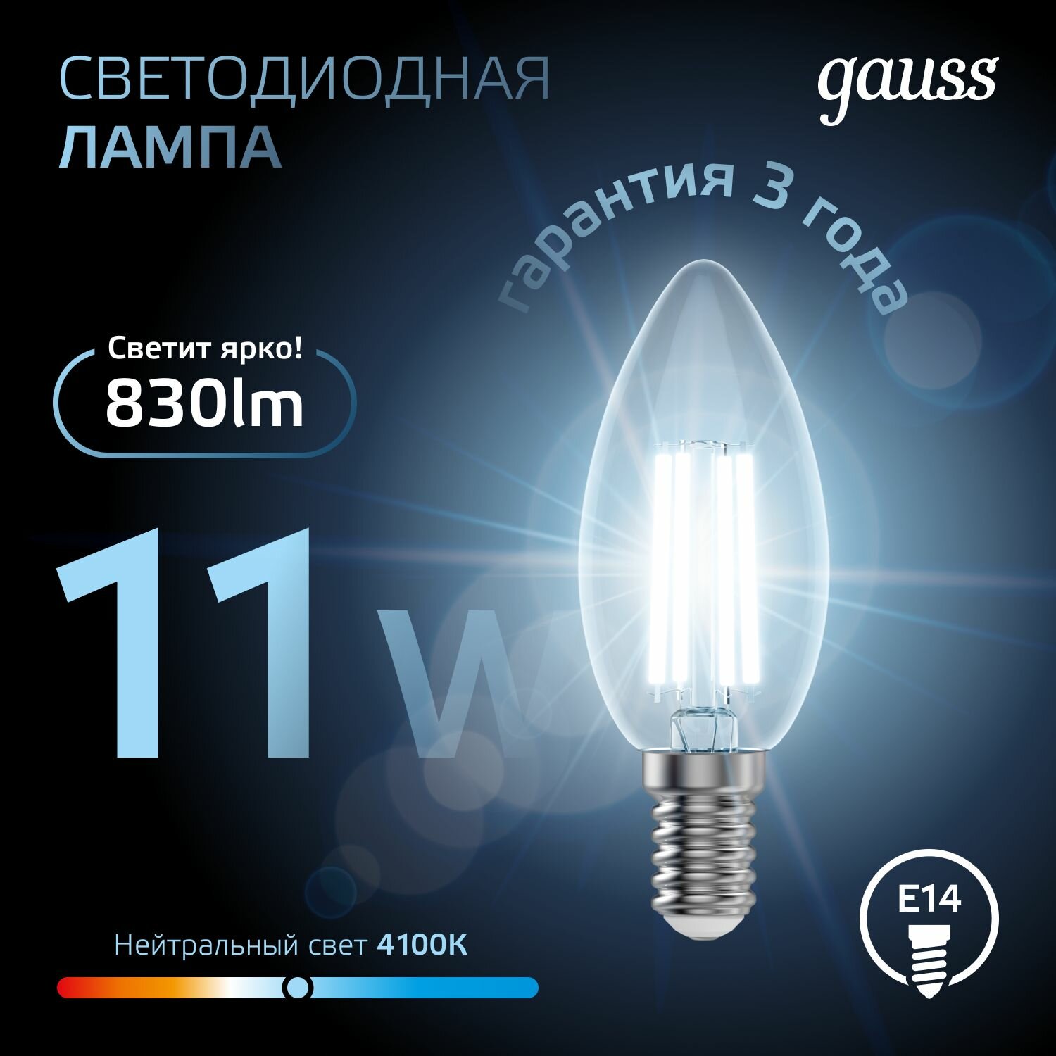 Лампа филам. Gauss 11Вт цок.:E14 свеча 220B 4100K св.свеч.бел.нейт. C37 (упак.:10шт) (103801211)