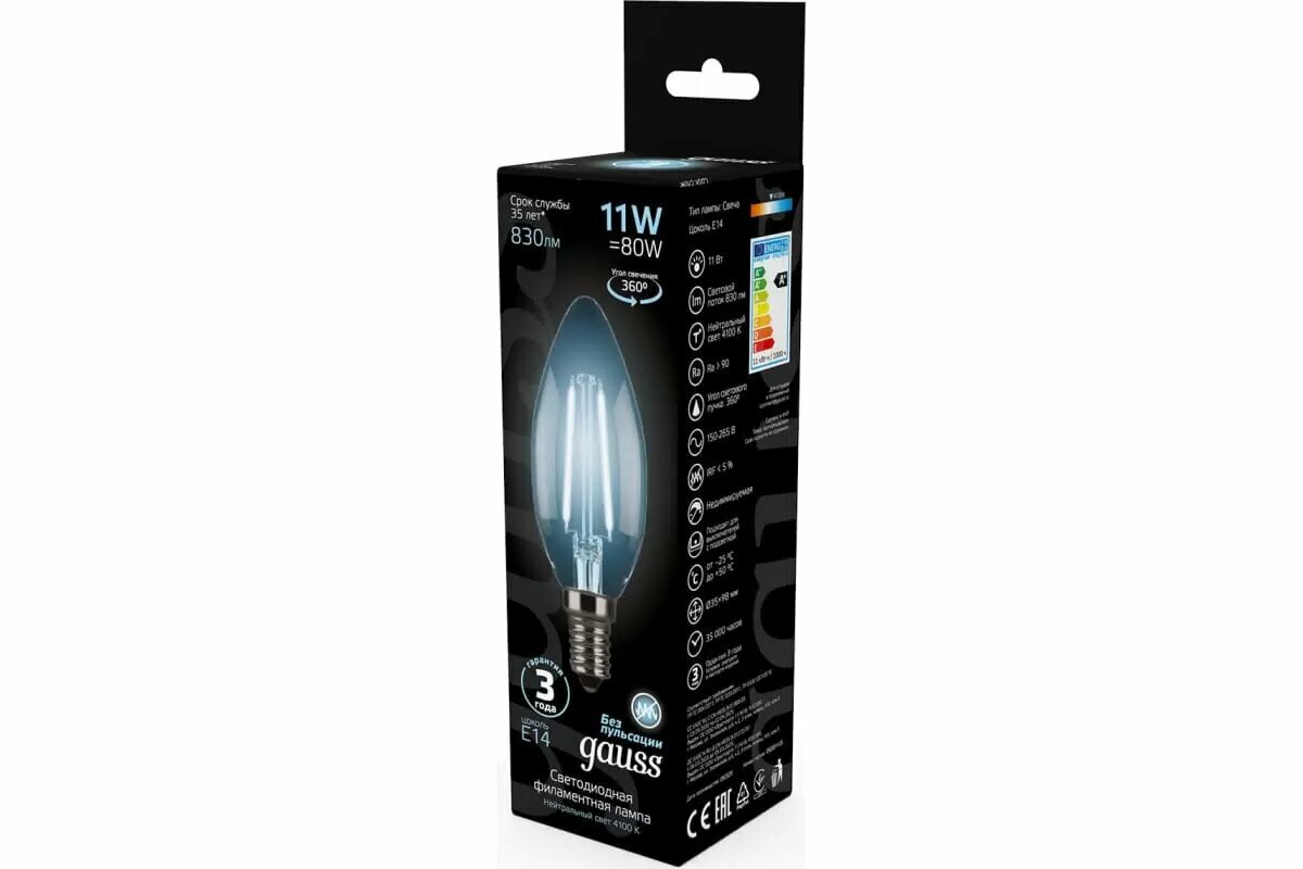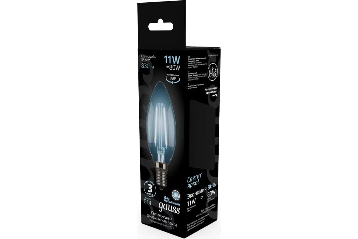 Купить Лампочка светодиодная E14 Свеча 11W 4100К нейтр белый свет 4100К упаковка 10 шт. Gauss Black Filament