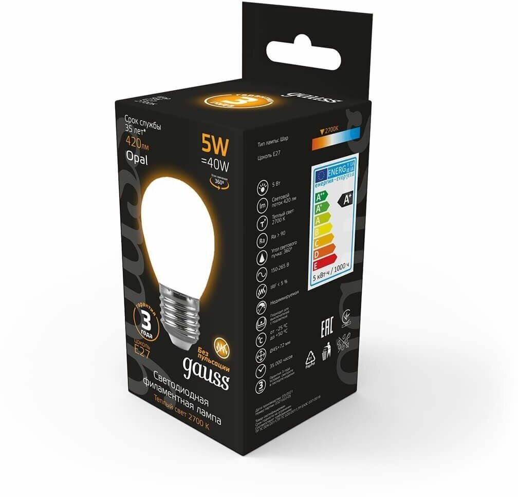 Лампочка светодиодная E27 Шар 5W теплый свет 2700K упаковка 10 штук Gauss Filament OPAL