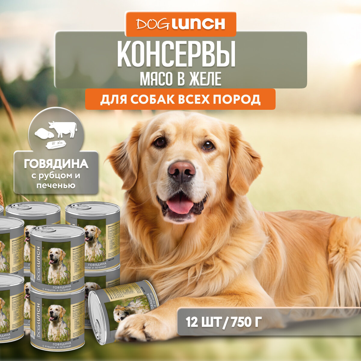 Консервы DOG LUNCH для собак с говядиной, рубцом и печенью в желе 750 гр х 12 шт