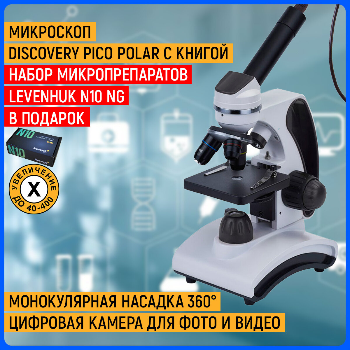 Микроскоп цифровой Discovery Pico Polar с книгой + Набор микропрепаратов Levenhuk N10 NG в подарок интересное: