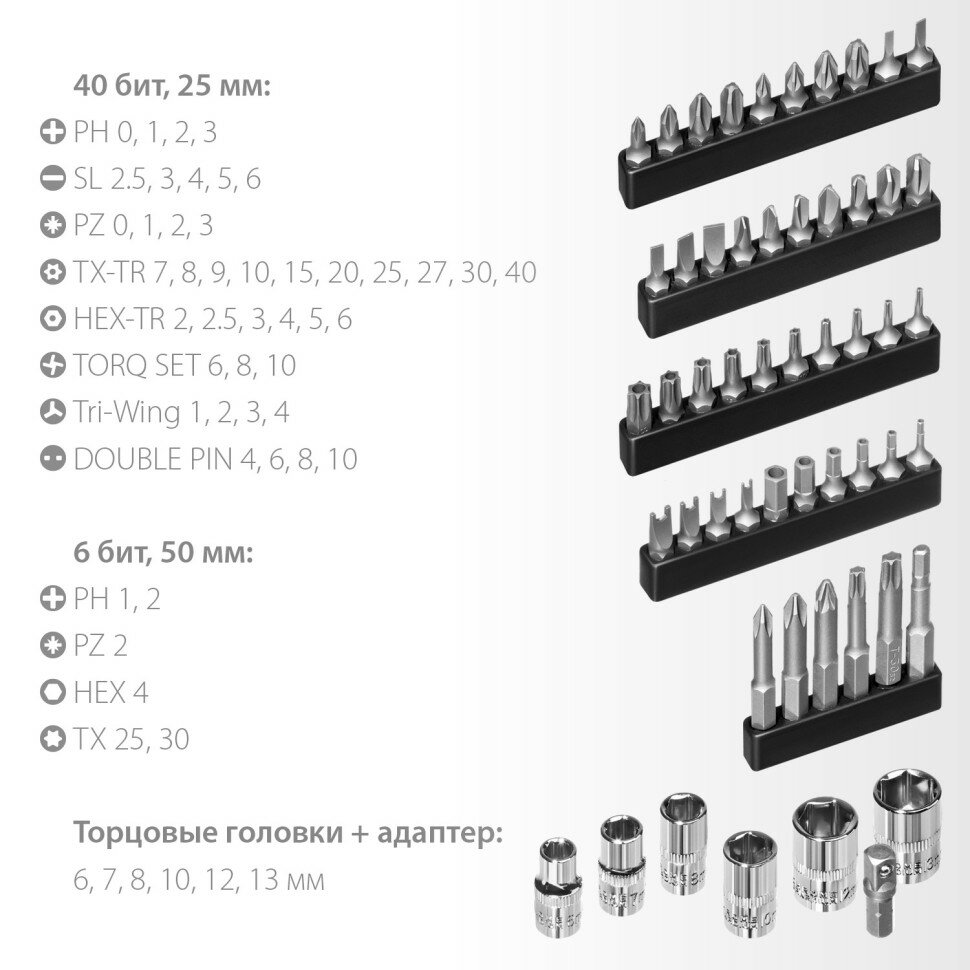 | Шлицы бит | Torx (T/TX) / крестообразный (PH) / крестообразный (PZ) / прямой (SL) / трёхлопастной (tri-wing) / шестигранный (H/HEX) / DOUBLE PIN / SQUARE |