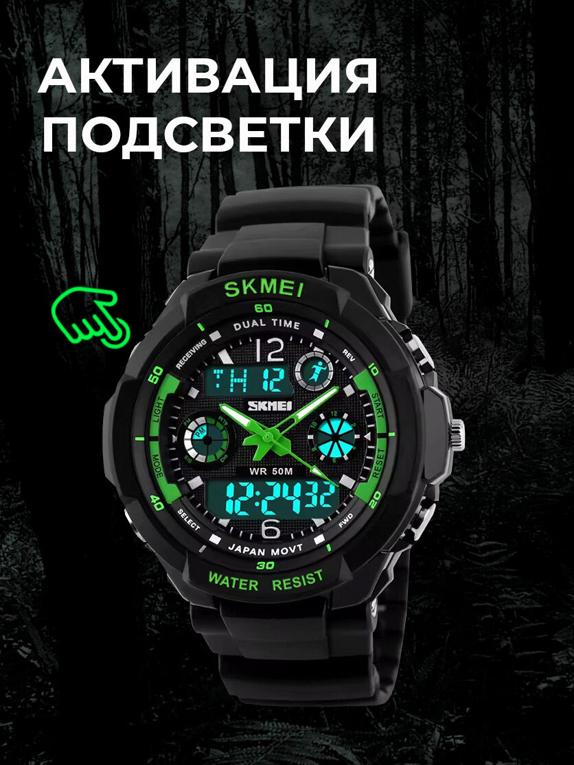 Часы наручные спортивные электронные мужские SKMEI противоударные, кварцевые, с подсветкой, черные/зеленые